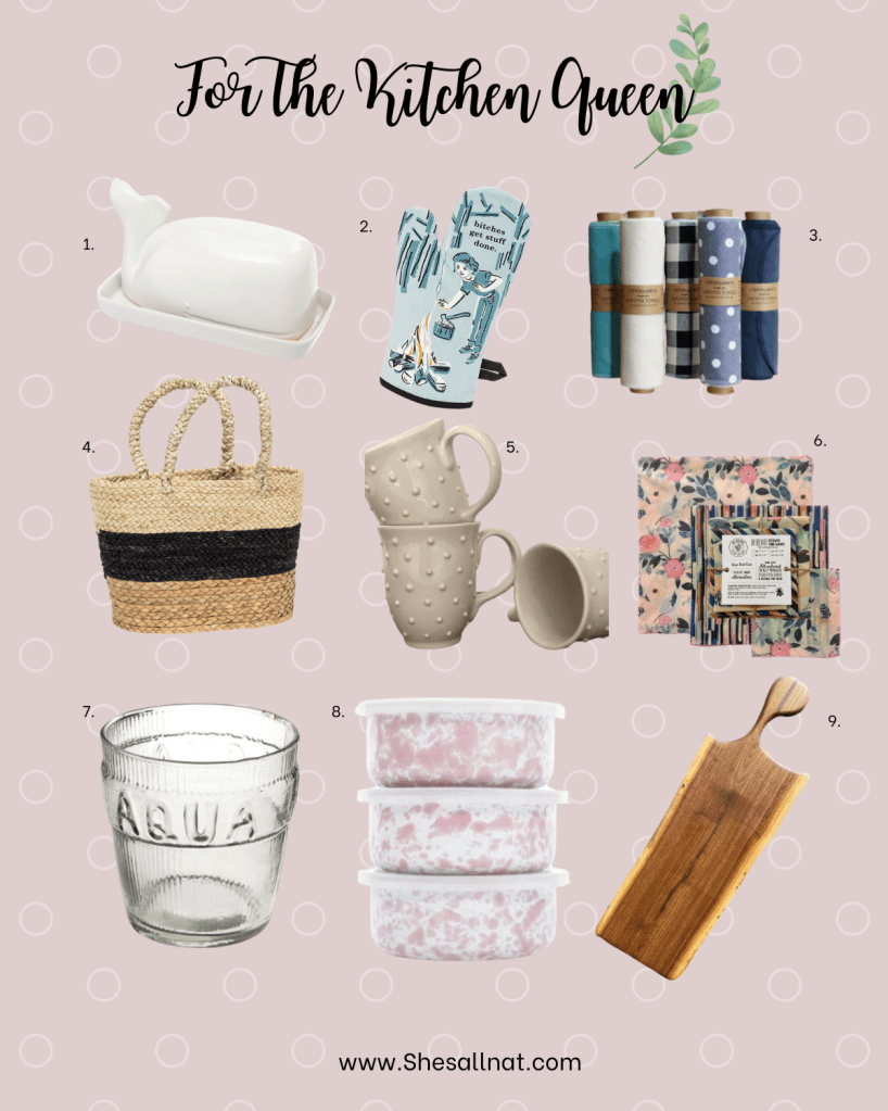 1 Whale Butter Dish l 2. Novelty Oven Mitt l 3. Reusable Un-Papertowel l 4. Market Bag l 5. Ceramic Mugs l 6. Bees Wax Food Wraps l 7. Water Glasses l 8. Stackable Food Storage Containers l 9. Charcuterie Board